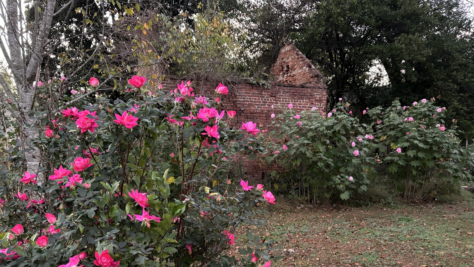 | I am enjoying our Knock-Out roses and Jubilee Hibiscuses* against our old brick ruin this fall. The first frost will kill the hibiscuses back to the ground. |